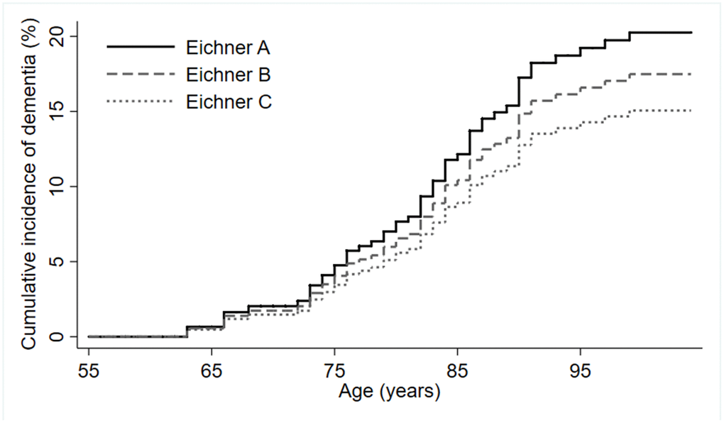 | Model with age as timescale, adjusted for sex, education, birth cohort, and practice effect. The reference group was Eichner Index A. | |||||||||||||||||||||||||||||||||||||||||||||||||||||||||||||||||||||||||||||||||||||||||||||||||||