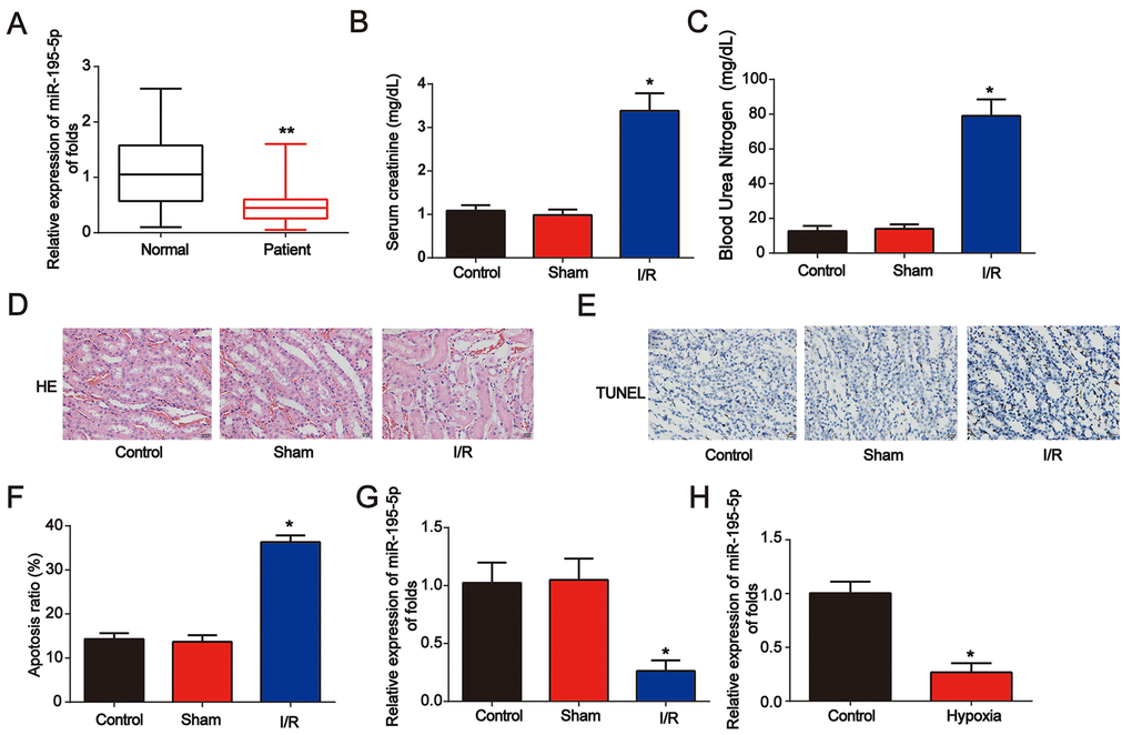 First, to study the effect of miR-195-5p in renal disease, serum samples from healthy controls (n = 80) and AKI patients (n = 80) were obtained. qRT-PCR was performed and miR-195-5p levels were decreased in AKI patients (Figure 1A). Then, as shown in Figure 1B and 1C, a renal I/R rat model was established, and serum Cr and blood urea nitrogen (BUN) levels were markedly increased after I/R surgery. Acute kidney injury was triggered as indicated by HE staining and TUNEL assay (Figure 1D–1F). In the renal I/R rat model, miR-195-5p was markedly increased (Figure 1G). In addition, an in vitro assay was performed. NRK-52E cells were randomly assigned into two groups: control (normoxic conditions for 6 h) and hypoxia (hypoxic conditions for 6 h). We found that miR-195-5p was inhibited after NRK-52E cells were exposed to hypoxia treatment for 6 h (Figure 1H). These data indicate that miR-195-5p is involved in AKI progression.