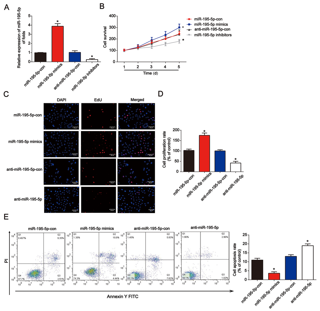 Next, miR-195-5p mimics or inhibitors were transfected into NRK-52E cells for 48 h. qRT-PCR was used to confirm the efficiency of the miR-195-5p mimics or inhibitors in NRK-52E cells (Figure 2A). In Figure 2B, miR-195-5p mimics markedly increased cell survival, while the inhibitors reduced NRK-52E cell survival, as demonstrated by the CCK-8 assay. In addition, the EdU assay showed that NRK-52E cell proliferation was induced by miR-195-5p mimics, while repressed by miR-195-5p inhibitors (Figure 2C and 2D). Additionally, after transfection for 48 h, miR-195-5p rescued the apoptotic cells induced by hypoxia, as indicated by the flow cytometry assay (Figure 2E). miR-195-5p mimics reduced the ratio of apoptotic cells induced by hypoxia, as indicated by the flow cytometry assay. miR-195-5p inhibitors contributed to NRK-52E cell apoptosis These results indicated that miR-195-5p improved NRK-52E cell proliferation and inhibited cell apoptosis.
