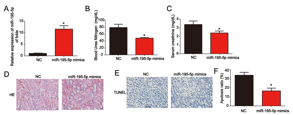 Moreover, miR-195-5p levels were significantly increased in renal tissues (Figure 3A). Meanwhile, serum Cr levels and BUN levels in I/R rat models transfected with miR-195-5p mimics were also reduced by miR-195-5p (Figure 3B and 3C). Representative micrographs of renal histological staining indicated that miR-195-5p repressed kidney injury (Figure 3D). Analysis of the TUNEL assay revealed that the apoptosis induced by I/R was reduced by miR-195-5p mimics (Figure 3E and 3F). These results indicated that miR-195-5p repressed I/R-triggered renal injury.