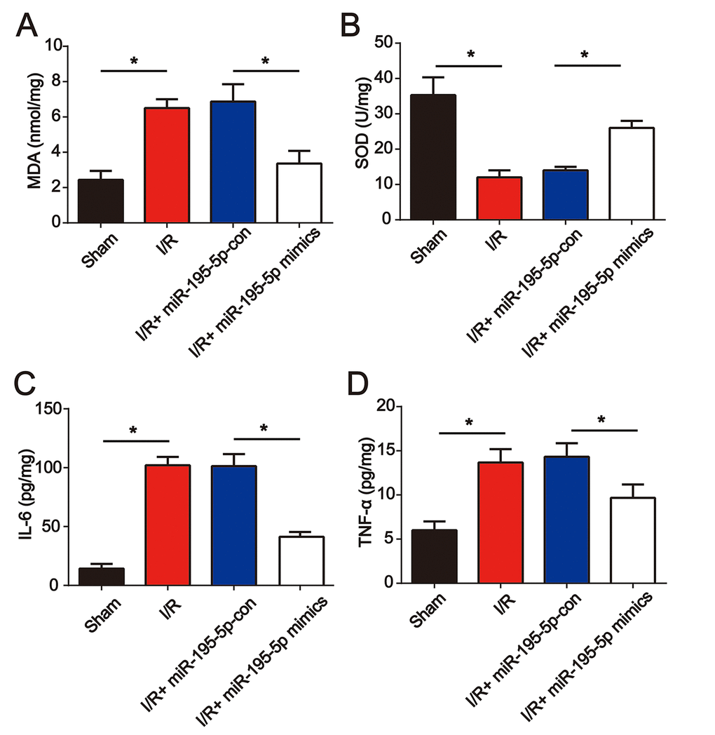 Furthermore, before I/R surgery, miR-195-5p mimics were injected into the rat via the tail vein. We found that miR-195-5p mimic treatment repressed I/R-induced MDA and reduced SOD (Figure 4A and 4B). In addition, IL-6 and TNF-α levels were dramatically elevated at 24 h post renal I/R surgery (Figure 4C and 4D). Renal I/R-triggered cytokine production was reduced by miR-195-5p (Figure 4C and 4D). These results indicated that miR-195-5p ameliorated oxidative stress and inflammation in renal injury.