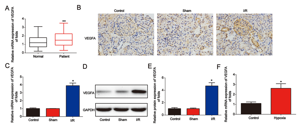 Next, we found that VEGFA expression was significantly increased in AKI patients (Figure 6A). Then, in Figure 6B, in the renal I/R rat model, IHC staining indicated that VEGFA was greatly increased (Figure 6B). In addition, as shown in Figure 6C–6E, VEGFA mRNA and protein levels were upregulated. VEGFA was also induced by hypoxia in NRK-52E cells (Figure 6F). These data indicated that VEGFA was overexpressed in AKI.