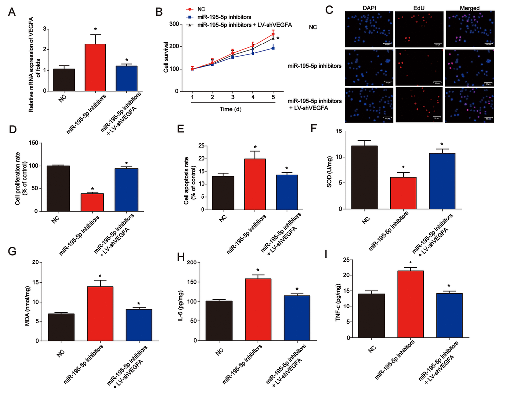 In Figure 7A, NRK-52E cells were exposed to hypoxic conditions for 6 h. Cells were then transfected with miR-195-5p inhibitors for 48 h before infection by LV-shVEGFA. We found that VEGFA was successfully repressed by LV-shVEGFA. The CCK-8 assay showed that miR-195-5p-induced cell survival was inhibited by the loss of VEGFA (Figure 7B). In Figure 7C and 7D, the EdU assay showed that NRK-52E cell proliferation was also repressed by the knockdown of VEGFA. In addition, NRK-52E cell apoptosis was reduced by the loss of VEGFA (Figure 7E). miR-195-5p inhibitors and LV-shVEGFA were injected into the rat via the tail vein. We found that SOD was inhibited by miR-195-5p inhibitors, which could be reversed by VEGFA shRNA in vivo (Figure 7F). MDA content in the kidney tissues was increased by miR-195-5p inhibitors, while loss of VEGFA was reduced (Figure 7G). In addition, inflammation factors IL-6 and TNF-α protein levels were also markedly repressed by the inhibition of VEGFA, as shown in Figure 7H and 7I.