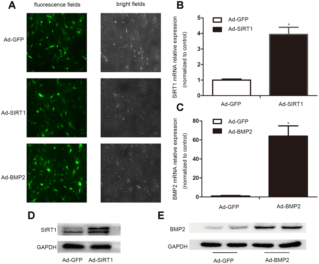 Recombinant adenoviruses expressing GFP, BMP2, and SIRT1 and cell transfection