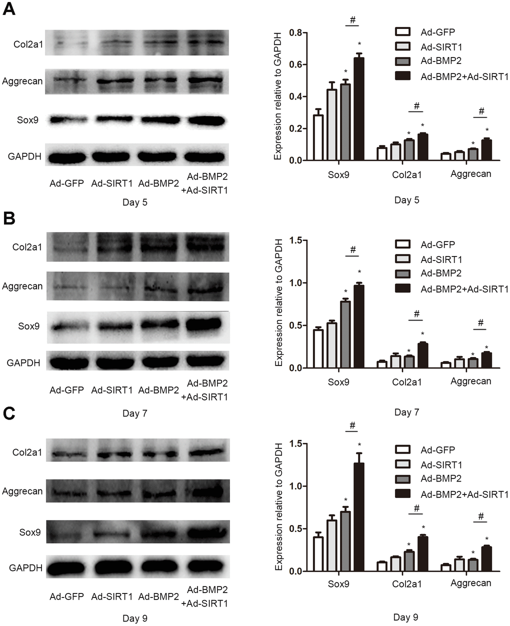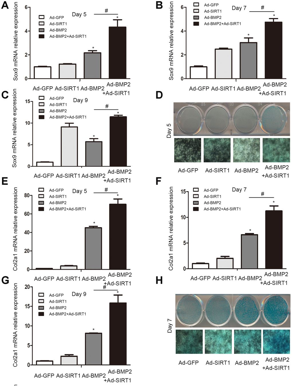 Sox9, a key regulator of early chondrogenic differentiation expression, was detected by western blotting on the 5th, 7th, and 9th day after the C3H10T1/2 cells were infected with Ad-GFP, Ad-SIRT1, Ad-BMP2, or Ad-SIRT1+Ad-BMP2. We found that the expression of Sox9 in the Ad-SIRT1+Ad-BMP2 group was significantly higher than that in the Ad-BMP2 group, and the expression levels were significantly higher in both groups compared with that in the control group (Figure 2, P < 0.05). We also detected the Sox9 downstream regulatory genes type II collagen (Col2a1) and aggrecan using the western blotting method. The results showed that SIRT1 could significantly promote the expression of Col2a1 and aggrecan in BMP2-induced chondrogenic differentiation of the C3H10T1/2 cells (Figure 2, P < 0.05). At the same time, we examined the levels of Sox9 and Col2a1 mRNA on the 5th (Figure 3A, 3E, p < 0.05), 7th (Figure 3B, 3F, p < 0.05), and 9th (Figure 3C, 3G, p < 0.05) day using real-time PCR. PCR analysis showed that the expression of cartilage markers (Sox9 and Col2a1) in both the Ad-SIRT1+Ad-BMP2 group and Ad-BMP2 group was significantly higher than that in the control group, and the expression of cartilage makers in the Ad-SIRT1+Ad-BMP2 group was significantly higher than that in the Ad-BMP2 group. In addition, Alcian blue staining was used to observe the secretion of extracellular matrix after the 5th (Figure 3D) and 7th (Figure 3H) day of adenovirus infection. The results showed that cells in the Ad-BMP2+Ad-SIRT1 group secreted more extracellular matrix than those in the BMP2 group.