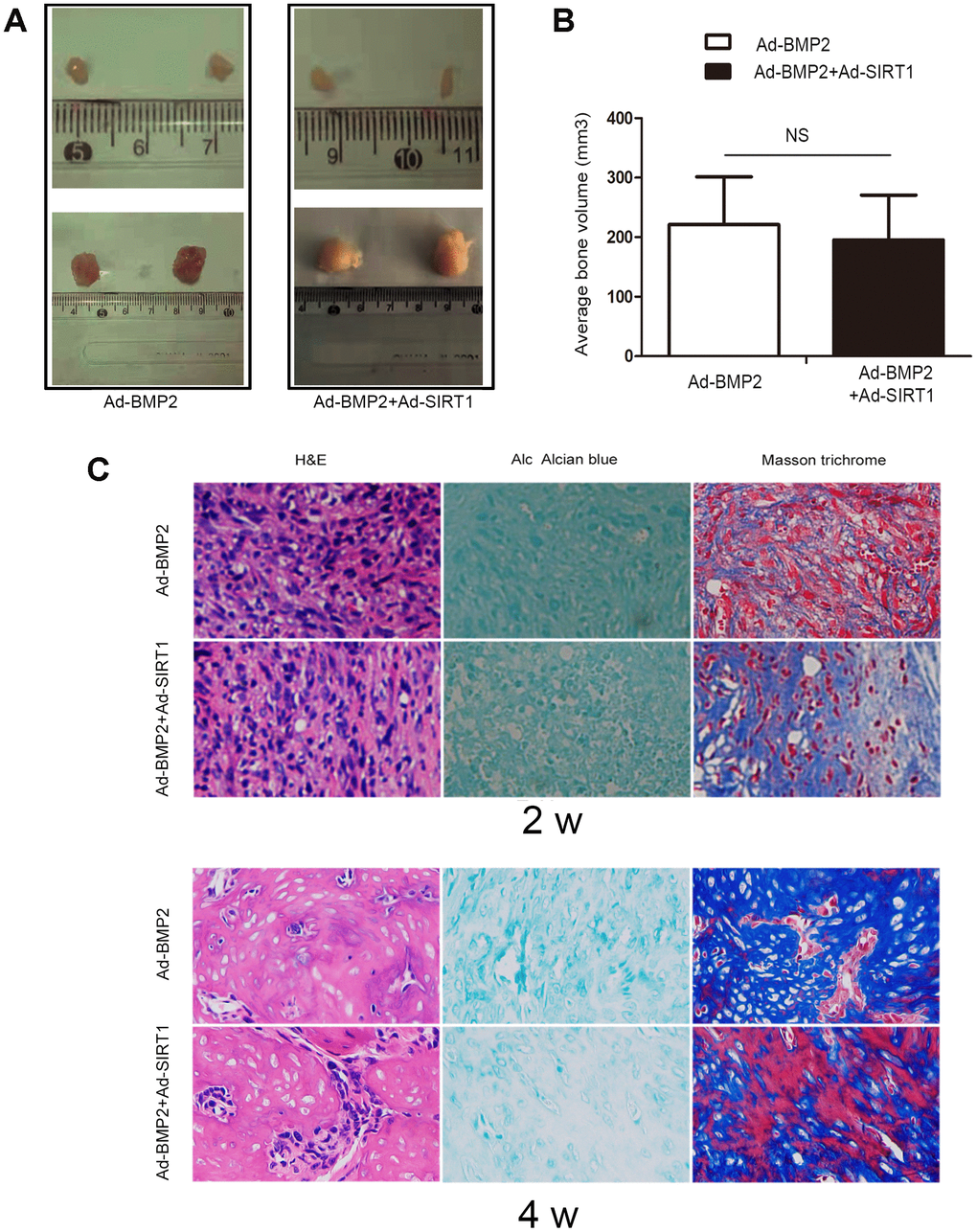In order to verify the effect of SIRT1 on BMP2-induced chondrogenic differentiation of stem cells, we also carried out stem cell transplantation experiments. After 2 and 4 weeks of injection with C3H10T1/2 cells, the animals were euthanized, and the bony mass was removed. The C3H10T1/2 cells infected with either Ad-SIRT1 or Ad-GFP alone did not yield any detectable masses (Figure 4A). We measured the bone tissue size of the Ad-BMP2 and Ad-BMP2+Ad-SIRT1 group, and there was no significant difference between them (Figure 4B). Hematoxylin and eosin, Alcian blue, and Masson trichrome staining were performed on the extracted bony mass (Figure 4C). The staining showed that the cartilage morphology including chondrocytes and chondrocyte lacunae in the Ad-SIRT1+Ad-BMP2 group was more obvious than that in the Ad-BMP2 group after 2 weeks of injection. At the fourth week, the cartilage lacuna and differentiation of bone tissue were more obvious compared in two weeks. Simultaneously, in the Ad-SIRT1+Ad-BMP2, the bone tissue was more mature and differentiated into osteoblasts compared with group infected with BMP2 in four weeks.