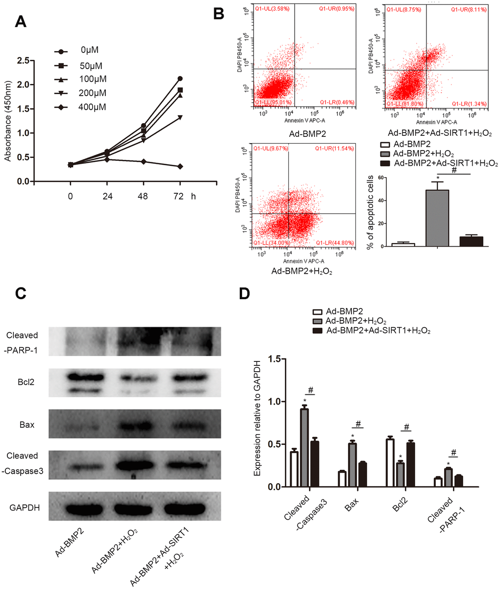 CCK8 was used to detect apoptotic cells treated with different concentrations (0, 50, 100, 200, and 400 μM) of H2O2 (Figure 5A). With the increase in H2O2 concentration, the decrease of cell absorbance at 450 nm indicated an increase in cell apoptosis. We selected the appropriate concentration (200 μM) according to the results of the CCK8 assay for subsequent experiments. We used flow cytometry to detect apoptosis of Ad-BMP2, Ad-BMP2+H2O2, and Ad-BMP2+Ad-SIRT1+H2O2 cells (Figure 5B). The results showed that H2O2 could promote cell apoptosis, but the apoptotic rate of the Ad-BMP2+Ad-SIRT1+H2O2 group was significantly lower than that of the Ad-BMP2+H2O2 group. In addition, we detected apoptosis-related proteins (Bcl-2, Bax, Cleaved-PARP-1, Cleaved-Caspase3) using the western blotting method (Figure 5C, 5D). The results showed that the expression of Bax, Cleaved-PARP-1, and Cleaved-Caspase3 proteins increased and the expression of Bcl-2 protein decreased in the Ad-BMP2+H2O2 group compared with the Ad-BMP2 group, and the Ad-BMP2+Ad-SIRT1+H2O2 group exhibited opposite results.