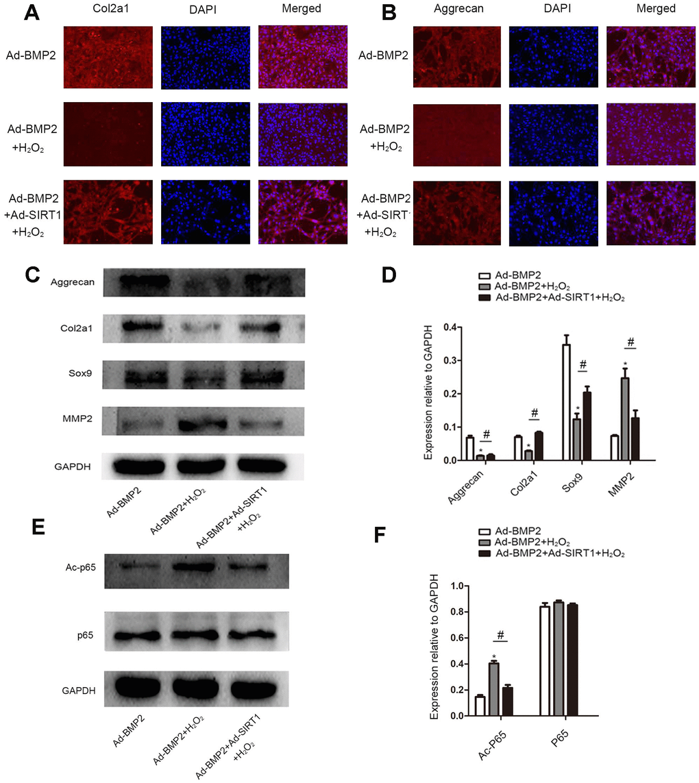 The C3H10T1/2 cells were seeded in a 6-well plate with glass coverslips and infected with Ad-BMP2, Ad-BMP2+H2O2, or Ad-BMP2+Ad-SIRT1+H2O2 for 3 days. The cells were washed with PBS, fixed with 4% paraformaldehyde for 30 min at room temperature, and again washed with PBS. The cells were permeabilized with 0.1% Triton X-100 (Beyotime, China) at room temperature for 20 min, blocked with 1% bovine serum albumin (Beyotime, China) for 1 h, and incubated with primary antibody (anti-Col2a1, 1:200; anti-Aggrecan, 1:50) at 4°C overnight. Subsequently, the cells were incubated with Alexa Fluor®594-conjugated secondary antibody for 1 h in the dark at 37°C and washed with PBS. Finally, the nuclei were stained with DAPI (Beyotime, China) for 5 min in the dark.