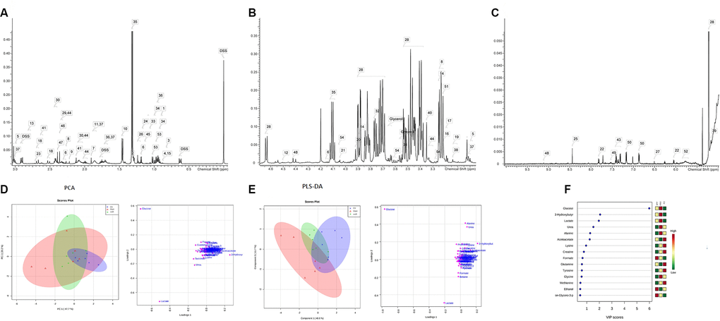 The absolute concentration of the metabolites was obtained through formula conversion using known DSS internal standard concentrations and its peak area was combined with peak areas of different metabolites on the NMR spectrum. The variable matrix was used as source data for subsequent PCA and PLS-DA analyses. First, principal component analysis (PCA) was conducted to distinguish between different groups of metabolic patterns, followed by partial least squares discriminant analysis (PLS-DA). PCA and PLS-DA were performed by conducting a data analysis using the PCA methods Bioconductor package and PLS package of R language, respectively. Finally a visual map was constructed using the ggplot2 package.