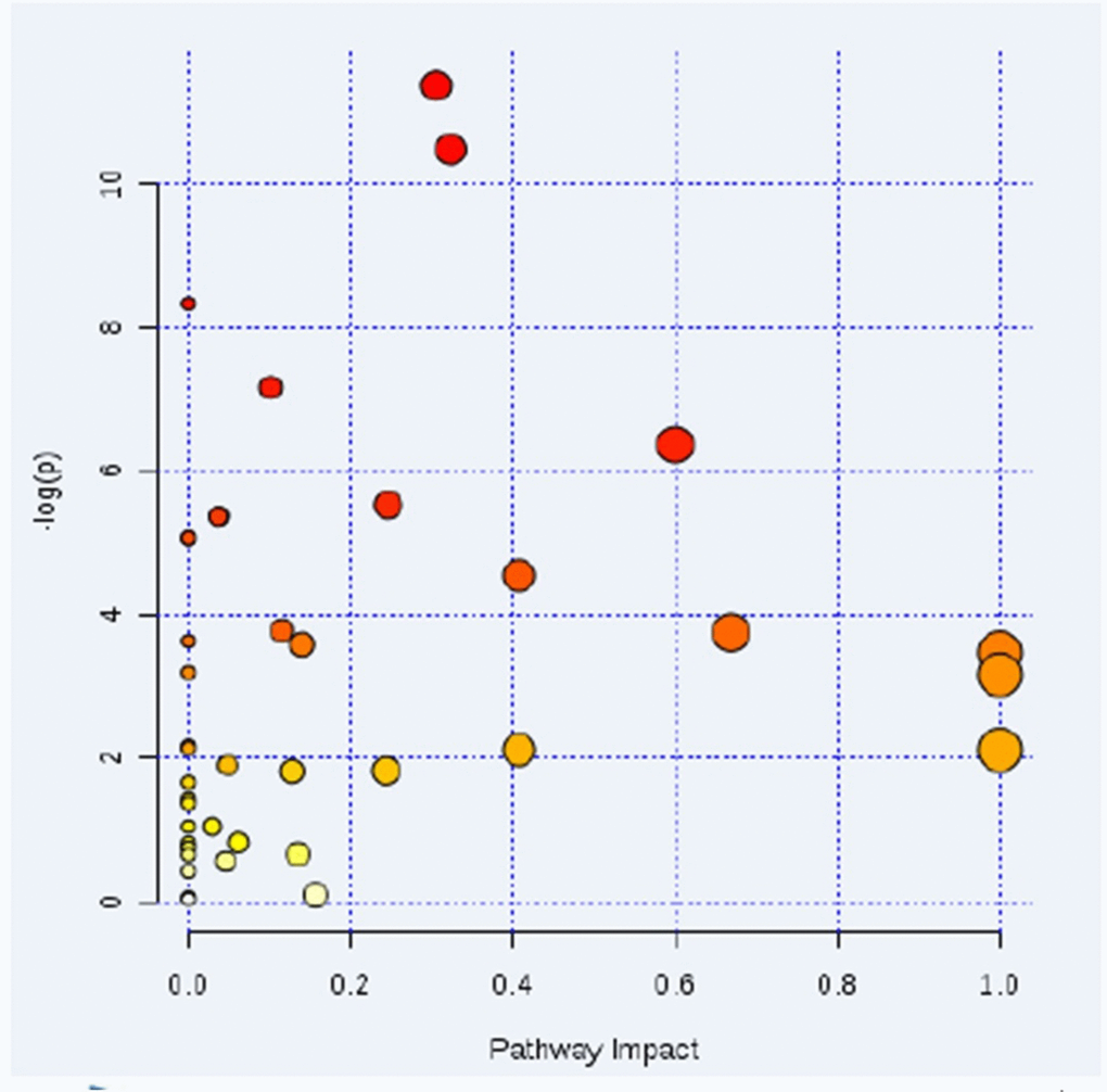 The serum metabolites were measured in each group 5 weeks after the model was established. Serum samples were collected from the abdominal aorta of the rats, and NMR spectra were mechanically obtained. Each serum acquisition parameter and its specific setting were set as follows: Temperature (K): 298.15, Magnet Frequency (MHz): 599.83, Transients/Scans: 64, Frequency Domain Size: 65536, Spectral Width: 7225.34, Time Domain Size: 28902 and Pulse Sequence: metnoesy.