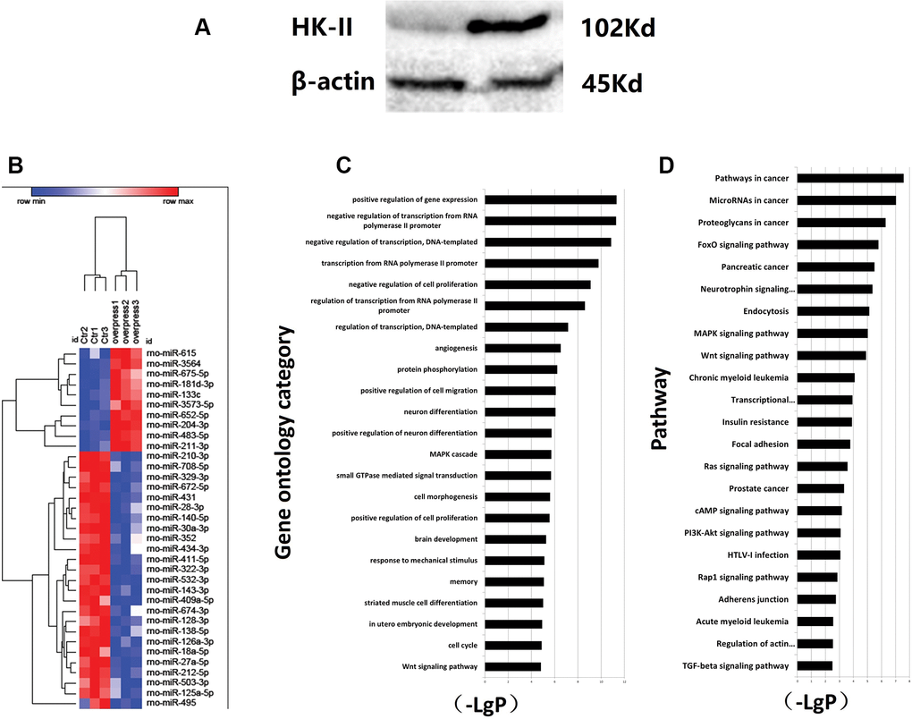 The PASMCs were transfected in vitro and then used to screen for miRNA molecules that were negatively correlated with HK-II expression. The control group and PASMCs overexpressing HK-II were detected using miRNA gene expression profiling.