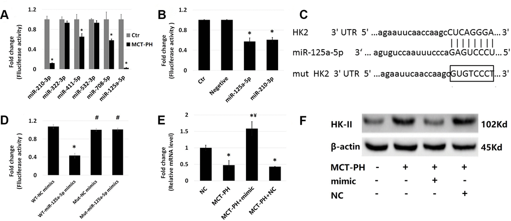 Due to increased expression of HK-II in PH, this study primarily screened microRNAs that acted on HK-II and lowered its expression in MCT-induced PASMC. We predicted that these microRNAs may directly act on HK-II and using the gene chip we identified 6 different microRNAs. The results showed that except for miR-322-3p and miR-532-3p expression, which had no difference on MCT-induced PASMCs, and the other four microRNAs resulted in decreased expression to different extents, with miR-125a-5p causing the most decrease. Widespread, tonic control of mRNAs encoded by genes relevant to blood pressure regulation by endothelial microRNAs [43]. miR-125a-5p ameliorated MCT-PH in rats, has a negative feedback regulation with TGF-β1 and IL-6, and regulates the proliferation and apoptosis of PASMCs by directly targeting STAT3 [44]. The decreased expressions of miR-125a-5p and miR-125b-5p are negatively associated with upregulation of preproET-1 expression in aorta of stroke-prone spontaneously hypertensive rats (SHR-SPs) [45]. We selected miR-210-3p and miR-125a-5p for the dual luciferase reporter gene experiments to verify whether they act on HK-II. The results suggest that these two microRNAs can inhibit the activity of luciferase to different degrees, while miR-125a-5p showed a higher inhibition rate. miR-125a-5p expression in PASMCs was found to be significantly downregulated under MCT-induced conditions, and miR-125a-5p mimic intervention could decrease HK-II expression and glycolysis, while inhibiting cell proliferation.