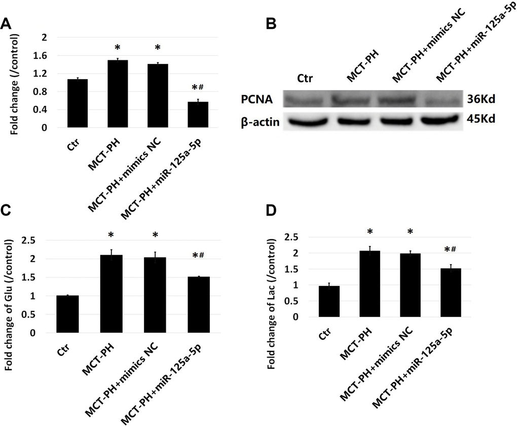 The glucose consumption of the PASMCs in MCT-PH group was significantly higher than that of the PASMCs in normal group (Figure 5C). The levels of lactic acid produced by PASMCs transfected with miR-125a-5p was significantly higher than that produced under normal conditions (Figure 5D). After miR-125a-5p mimic intervention, glucose consumption and lactic acid production of the PASMCs decreased significantly, suggesting that glycolysis in PASMCs increases under MCT conditions and that miR-125a-5p mimic intervention could decrease glycolysis in PASMCs.