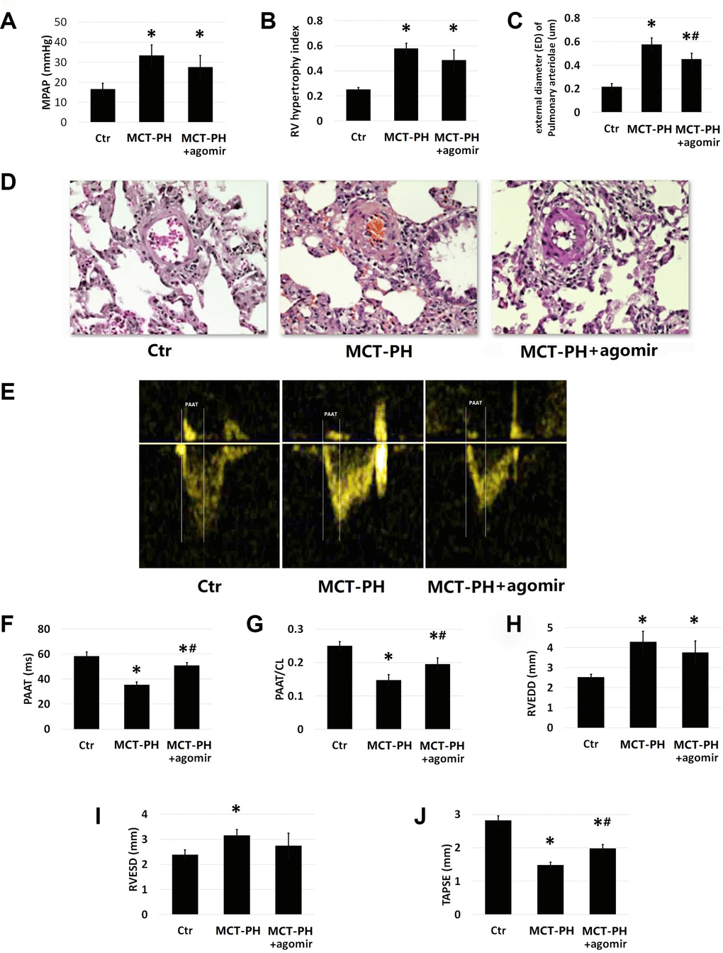 The mean pulmonary artery pressure (mPAP), RVHI and pulmonary vascular remodeling values measured in MCT-PH group were significantly higher than those of MCT-PH agomir group, (Figure 6A–6D), while the TAPSE, PAAT and PAAT/CL values of MCT-PH group were significantly lower than those of MCT-PH agomir group (p<0.05). Although the RVEDD and RVESD values of MCT-PH group were higher than that of MCT-PH agomir group, the difference was not significant (Figure 6E–6J).