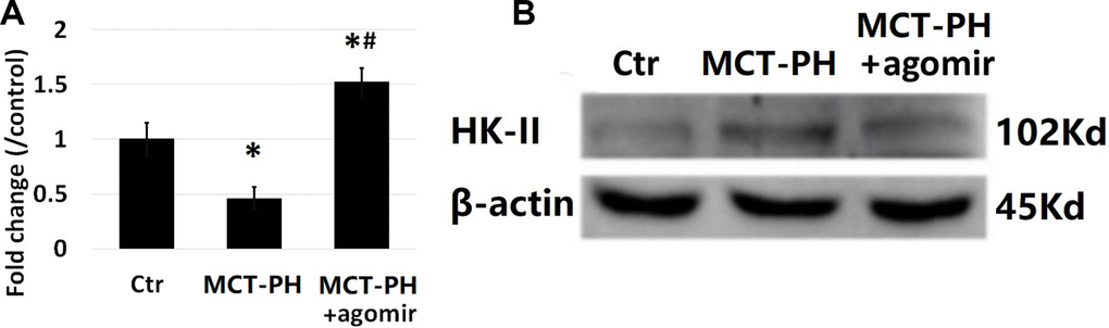 The expression of miR-125a-5p in the PASMCs decreased significantly in MCT-PH group (Figure 7A), while miR-125a-5p expression in MCT-PH agomirgroup was higher than that of MCT-PH group (Figure 7B). The HK-II expression of the PASMCs of MCT-PH group significantly increased compared with that of MCT-PH agomir group, demonstrating that miR-125a-5p negatively regulates the expression of HK-II in PASMCs. These results are consistent with cell levels and results of the in vivo experiments.