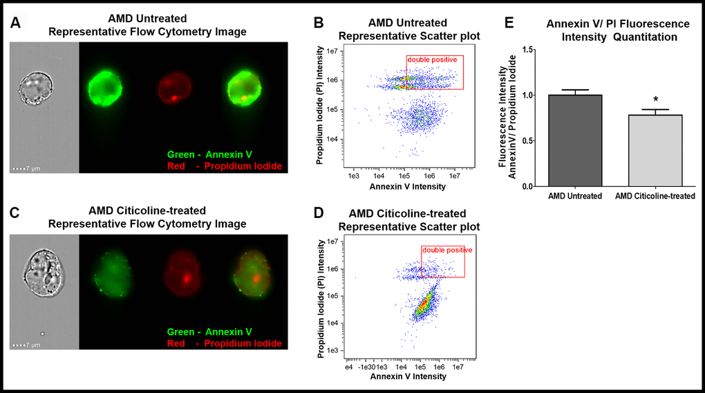 The ability of Citicoline to attenuate apoptosis was examined via Flow Cytometry analysis of untreated and Citicoline-treated AMD RPE cybrid cells stained with apoptotic and dead cell markers, namely Annexin V and Propidium Iodide (PI), respectively (Figure 1A–1E). Figure 1A and 1C show representative Flow cytometry images and Figure 1B and 1D show representative scatter plots of untreated and Citicoline-treated AMD RPE cybrid cells stained with Annexin V/ PI.