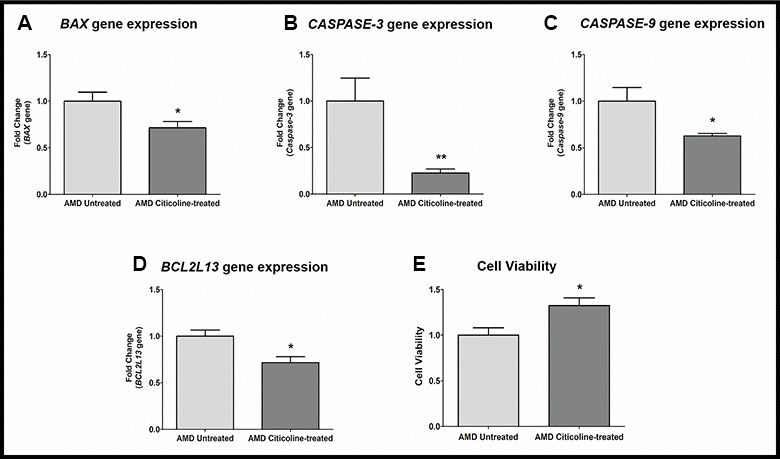 Apoptosis is regulated by multiple genes that act at various levels of the apoptotic cell death pathway. Exogenous addition of Citicoline downregulated the pro-apoptotic genes significantly (Figure 2A–2D). Compared to their untreated counterparts, Citicoline-treated AMD RPE cybrid cells showed decreased gene expression of: BAX gene by 28.6 % (AMD Untreated: 1 ± 0.096, AMD Citicoline-treated: 0.714 ± 0.068; p=0.03, n=8) (Figure 2A), Caspase-3 gene by 77.2 % (AMD Untreated: 1 ± 0.248, AMD Citicoline-treated: 0.228 ± 0.043; p=0.0079, n=5) (Figure 2B), Caspase-9 gene by 37.2 % (AMD Untreated: 1 ± 0.147, AMD Citicoline-treated: 0.628 ± 0.028; p=0.03, n=5) (Figure 2C), and BCL2L13 gene by 28.4 % (AMD Untreated: 1 ± 0.065, AMD Citicoline-treated: 0.716 ± 0.064; p=0.010, n=8) (Figure 2D). Furthermore, Citicoline treatment led to a 32.4 % increase in cell viability (AMD Untreated: 1 ± 0.081, AMD Citicoline-treated: 1.324 ± 0.084; p=0.015, n=6) (Figure 2E).