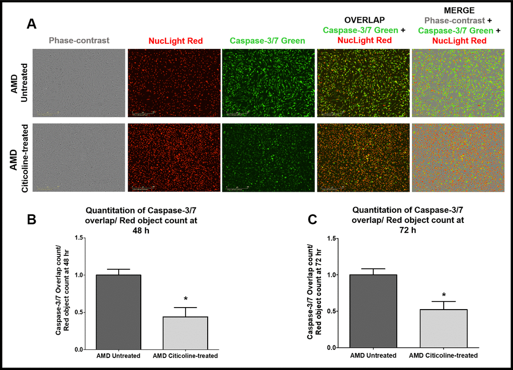 Next, we compared Caspase-3/7-mediated apoptosis between untreated and Citicoline-treated AMD RPE cybrid cells using IncuCyte® Live-Cell Imaging Analysis system and Caspase- 3/7 Green and NucLight Red reagents. The IncuCyte Caspase-3/7 Green Apoptosis Reagent couples the activated Caspase-3/7 recognition motif (DEVD) to a DNA intercalating dye and enables real-time quantification of cells undergoing caspase-3/7 mediated apoptosis. This reagent is an inert, non-fluorescent substrate which when added to culture medium, crosses the cell membrane where it is cleaved by activated caspase-3/7 resulting in the release of the DNA dye and fluorescent staining of the nuclear DNA. The IncuCyte NucLight Rapid Red Reagent is a cell permeable DNA stain that specifically stains nuclei in live cells and enables real-time quantification of cell proliferation. Addition of this reagent to normal healthy cells does not interfere with cell growth and morphology and provides homogenous staining of nuclei. In the culture medium, this inert stain crosses the cell membrane and has excellent specificity for DNA without the need for a wash step. In the current study, Citicoline-treated AMD cells showed significantly lower Overlap object count (i.e., (Caspase-3/7 Green + NucLight Red staining)/ Red object count) at 48 h and 72 h compared to their untreated counterparts. To our knowledge, this is the first study to demonstrate the role of Citicoline in reducing Caspase-3/7-mediated apoptosis in live cell imaging systems.