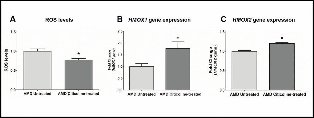 To measure reactive oxygen species levels, we performed ROS assay using H2DCFDA reagent. Compared to their untreated counterparts, Citicoline-treated AMD RPE cybrid cells showed decreased ROS levels by 22.8 % (AMD Untreated: 1 ± 0.059, AMD Citicoline-treated: 0.772 ± 0.040; p=0.013, n=5) (Figure 4A). Compared to their untreated counterparts, Citicoline-treated AMD RPE cells showed increased gene expression of: HMOX1 gene by 76.6 % (AMD Untreated: 1 ± 0.1267, AMD Citicoline-treated: 1.766 ± 0.28; p= 0.0379, n=8) (Figure 4B) and HMOX2 gene by 20.4 % (AMD Untreated: 1 ± 0.0214, AMD Citicoline-treated: 1.204 ± 0.020; p=0.0286, n=4) (Figure 4C).
