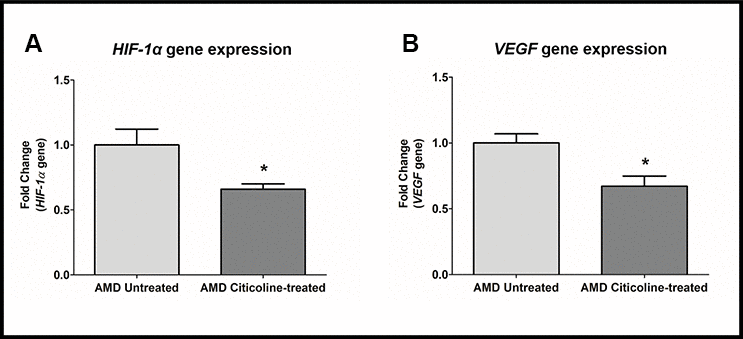 HIF1α (Hypoxia-inducible factor 1-alpha), a transcription factor, is a master regulator of cellular response to hypoxic stress. HIF-1α activation leads to up-regulation of VEGF, which in turn plays a key role in angiogenesis in choroidal neovascularization in AMD. Compared to their untreated counterparts, Citicoline-treated AMD RPE cybrid cells showed decreased gene expression of: HIF-1a gene by 34 % (AMD Untreated: 1 ± 0.123, AMD Citicoline-treated: 0.66 ± 0.041; p=0.01, n=7) (Figure 5A) and VEGF gene by 32.8 % (AMD Untreated: 1 ± 0.069, AMD Citicoline-treated: 0.672 ± 0.077; p=0.015, n=6) (Figure 5B).