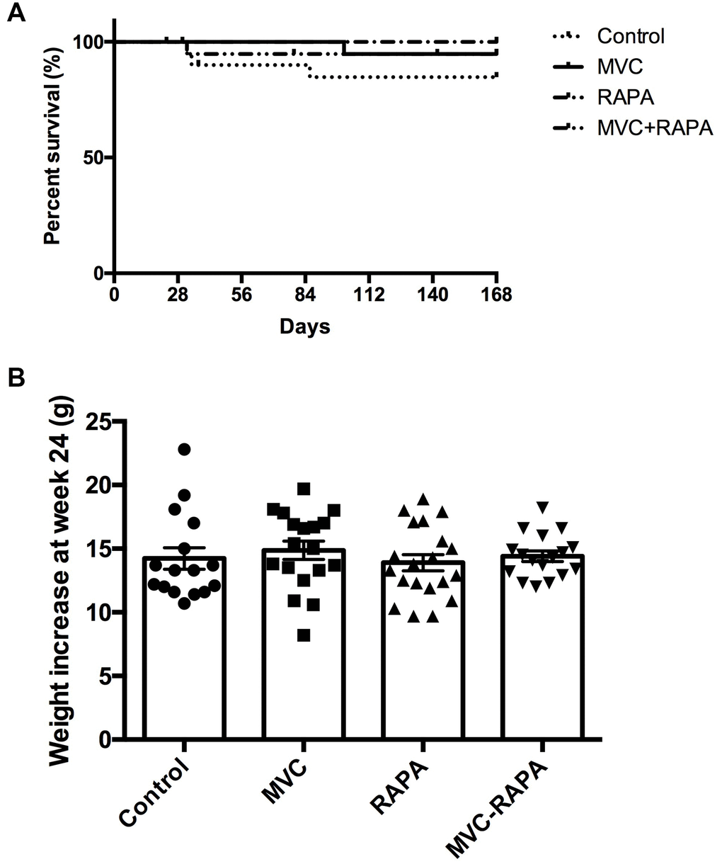 This study could have some limitations. First, life extension by RAPA is more prominent at higher doses [14] than the dose we have employed. However, our objective was not to improve survival. Indeed, there is a concern about potential side effects (i.e., glucose intolerance or insulin resistance) [52, 53] that may limit MVC-RAPA use as an anti-aging drug. Because it is known that deficiency of CCR5 impairs systemic glucose tolerance [54], the double impact on CCR5 (MVC plus RAPA) may be the reason for the highest increases in the HOMA index.