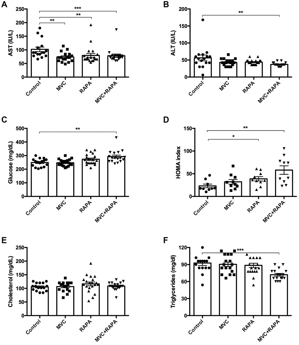 Significantly higher serum glucose levels were observed in the MVC-RAPA group (p<0.003). After analyzing the HOMA index, higher levels were observed in the RAPA (p=0.035) and MVC-RAPA (p<0.003) groups (Figure 2). Glucose and insulin tolerance test showed no differences (data not shown).