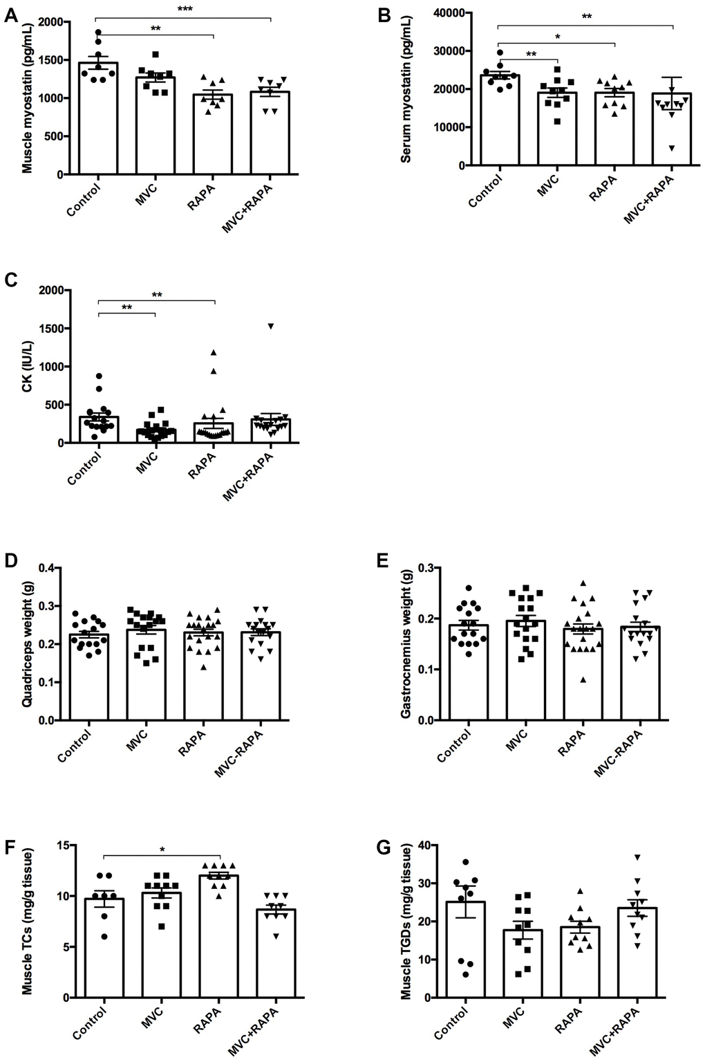 First, we have shown the beneficial effects of MVC and RAPA on myostatin, a negative regulator of muscle mass [35] that has been implicated in wasting conditions such as sarcopenia and cachexia [36]. In addition to the effects of myostatin on muscle mass, muscle myostatin deficiency has beneficial effects on metabolism, adiposity and insulin sensitivity [37]. Although previous studies have shown that muscle myostatin was not affected by RAPA administration [38], we have observed a decrease in its levels. To our knowledge, this effect has not been described previously for MVC.