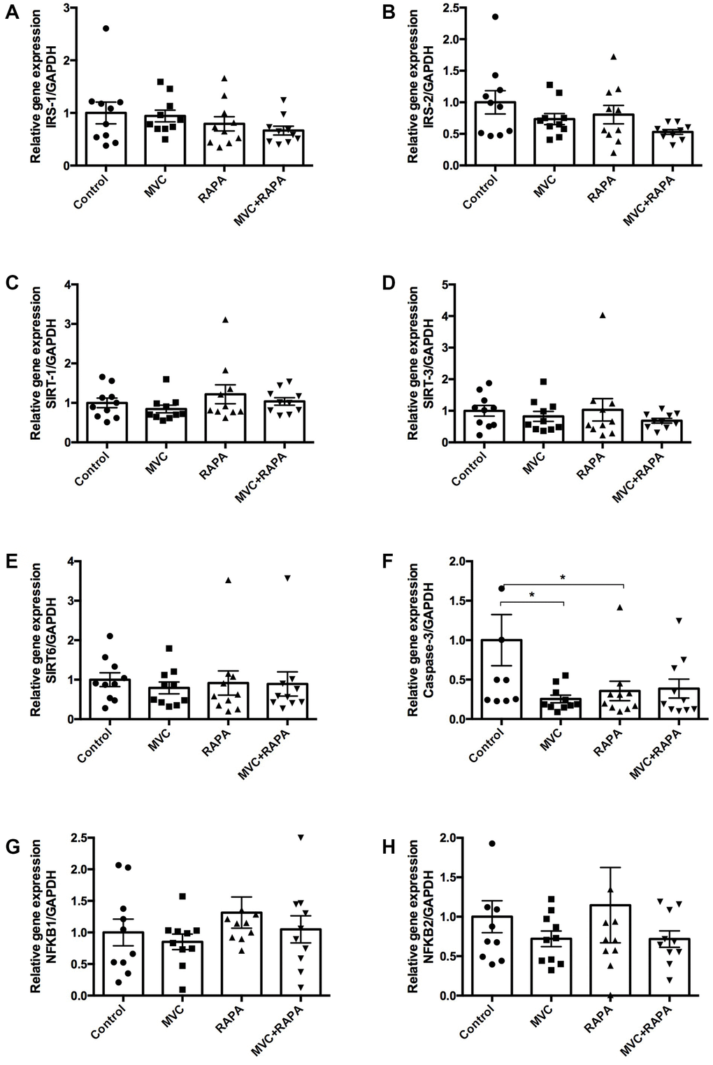IRS (1 and 2) showed no differences, although MVC-RAPA showed a tendency towards a lower level of IRS-2 (p=0.063). In the same way, SIRT (1, 3 and 6) showed no differences. Meanwhile, caspase-3, an inducer of apoptosis, was significantly lower in the MVC (p=0.011) and RAPA groups (p<0.05), showing also a clear tendency in the MVC-RAPA group (p=0.063). Finally, NFKB (1 and 2) showed no differences (Figure 4).