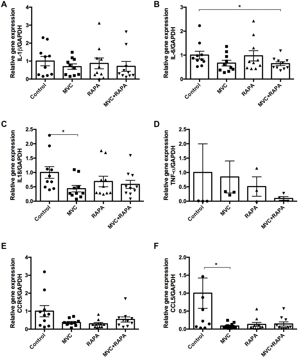 In this study, no differences were observed after analyzing muscle IL-1β. However, IL-6 levels were significantly lower in the MVC-RAPA group (p=0.028) and showed a tendency in the MVC group (p=0.089). Likewise, in muscle samples, IL-18 levels, another pro-inflammatory cytokine, were significantly lower in the MVC groups (p=0.014). No differences were observed after analyzing TNF-α. In the same way, no differences were observed after analyzing serum IL-1β, IL-6, or TNF-α (data not shown). In reference to chemokines, no differences in muscle CCR5 expression were observed after analyzing the different groups although there was a clear tendency in the RAPA group (p=0.054). Similarly, muscle CCL5 expression was significantly lower in the MVC group (p=0.035) and showed a clear tendency in the RAPA and MVC-RAPA groups (p=0.063 and p=0.052, respectively) (Figure 5).