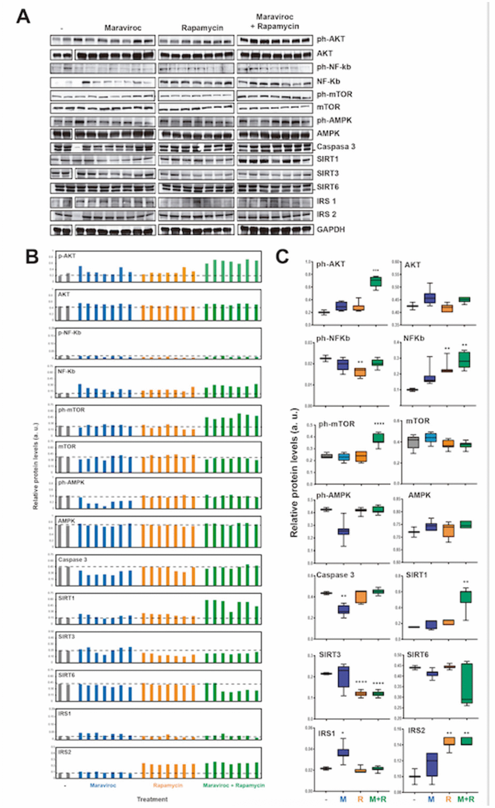 Finally, it is known that RAPA administration decreases CCR5 mRNA expression both in vitro [15] and in vivo (macaques) [16]. In addition, RAPA induced a synergistic enhancement of the CCR5 antagonists effects of vicroviroc [19] and aplaviroc [20] against HIV. To our knowledge, no studies have been performed on the synergistic effect of RAPA plus MVC. In this animal model, we did not observe a synergistic, additive or antagonistic effect on the level of CCR5 expression in the MVC-RAPA group. However, a synergistic increase in p-AKT, p-mTOR and SIRT1 protein levels upon MVC-RAPA treatment was observed, suggesting that they could have a protective effect.