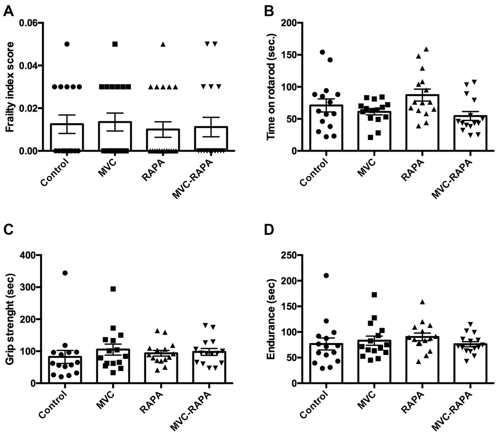 In the current study, our aim was to evaluate the effects of MVC and/or RAPA in an experimental mouse model of frailty.