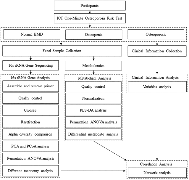 Bone turnover markers (BTMs) are biomarkers for fracture risk that are used for the diagnosis and evaluation of the effects of therapy on PMO; the reference BTMs are serum procollagen type I N propeptide (P1NP) and serum C-terminal telopeptide of type I collagen (CTX-1), markers for bone formation and resorption, respectively [26]. Furthermore, the International Osteoporosis Foundation (IOF) recommends the use of CTX-1 and P1NP as BTMs in clinical studies on osteoporosis [27]. Nonetheless, the evidence for an association between bone metabolism and the gut microbiota in PMO remains inadequate. The aim of the present study was to investigate whether intestinal microbiota features are associated with BMD and BTMs in PMO using 16S rRNA gene sequencing and LC/MS-based metabolomics (Figure 1).