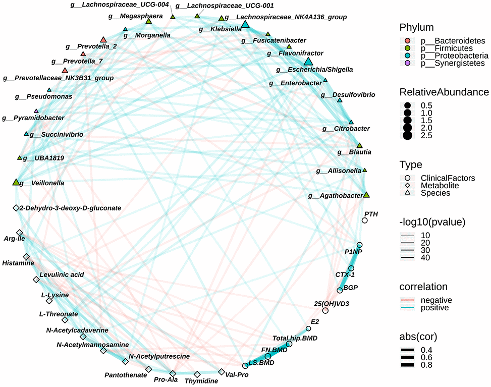 The relationships among the different bacteria, different metabolites and clinical profilers were examined by correlation analysis (Spearman) to evaluate the relationship between the gut bacteria and fecal metabolites and between the gut bacteria and clinical profiles. We found that osteopenia-enriched N-acetylmannosamine correlated negatively with LS. BMD, FN. BMD and total hip BMD. A previous study reported that treatment with N-acetylmannosamine inhibited arthritis-mediated bone loss in mice [29]. We also found that N-acetylputrescine and N-acetylcadaverine correlated positively with N-acetylmannosamine (Figure 5 and Supplementary Table 4). Histamine, which is related to PMO, was positively associated with N-acetylcadaverine. PMO-enriched Arg-Ile correlated negatively with LS. BMD and FN. BMD (Figure 5 and Supplementary Table 4). Conversely, there was a positive association between Prevotella_7 enrichment in controls and BMD, including LS. BMD and total hip BMD. Blautia was positively associated with LS. BMD (Figure 5 and Supplementary Table 4). Interestingly, osteopenia-enriched L-threonate correlated positively with Escherichia/Shigella, Enterobacter, and Citrobacter (Figure 5 and Supplementary Table 4), which are from Proteobacteria and enriched in the postmenopausal osteopenia group. Postmenopausal osteopenia-enriched L-lysine correlated negatively with Blautia and Fusicatenibacter (Figure 5 and Supplementary Table 4), which were enriched in the control group. In addition, we found that osteopenia-enriched Allisonella, Klebsiella and Megasphaera correlated positively with P1NP and CTX-1 (Figure 5 and Supplementary Table 4). Altogether, these results indicate that the distinguishing metabolites were closely related to gut bacteria variation and that the distinguishing metabolites and intestinal bacteria were related to postmenopausal osteopenia and PMO, even though it remains to be explored whether these metabolites are directly produced by the intestinal bacteria.