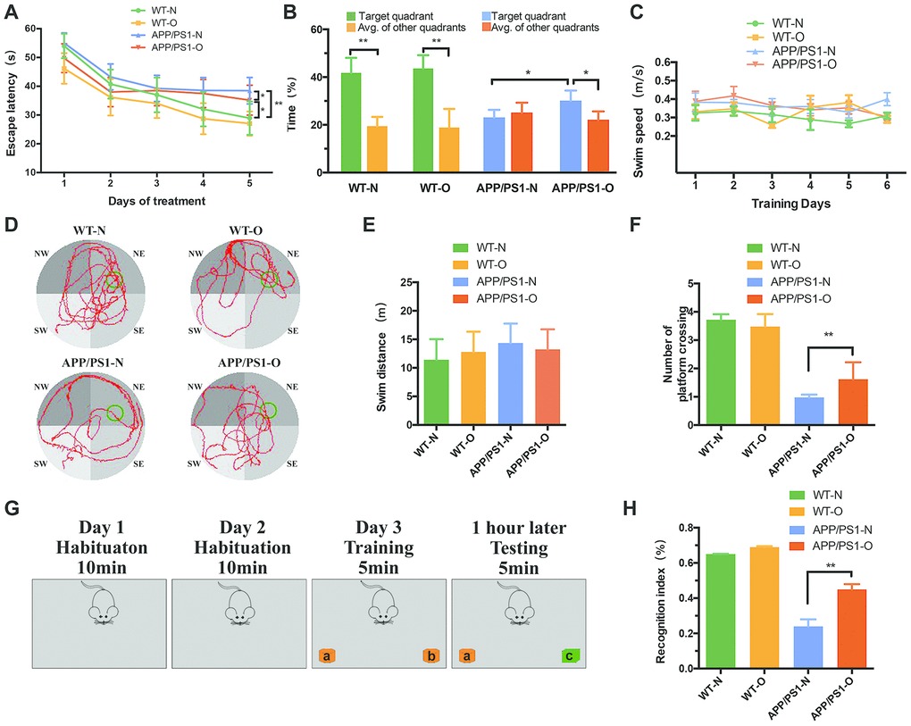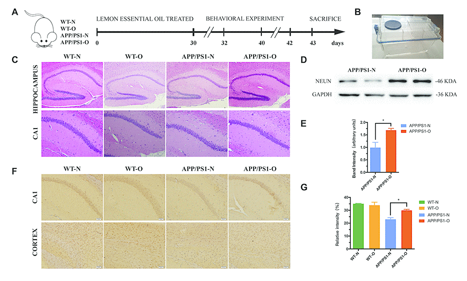 Eight-month-old male C57BL/6 and APP/PS1 mice were obtained from the Beijing Vital River Laboratory Animal Technology Co., Ltd. and were housed as five mice per cage under controlled temperature (22 ± 2°C) and humidity (50 ± 5%) on a normal 12-h light/ dark cycle with food and water ad libitum. All experimental procedures were conducted in according to the guidelines relevant to the Care and Use of Laboratory Animals published by the US National Institutes of Health. LEO was purchased from Shanghai Yuanye Bio-Technology Co., Ltd. Inhalation of LEO was conducted using an individual ventilated cage (IVC), which was made of acrylate board (33 cm × 20 cm × 18 cm) and could vaporize and distribute LEO evenly. APP/PS1 and WT mice were randomly assigned into one of four groups respectively: the WT water-treated group (WT-N group, n = 12), the WT LEO-treated group (WT-O group, n = 12), the APP/PS1 mice water-treated group (APP/PS1-N group, n = 12), and APP/PS1 mice LEO-treated group (APP/PS1-O group, n = 12). We treated mice starting at 8 months of age with water or LEO (1 mL/cage) inhalation in the IVC for 1 hour over a period of 30 days. After treatment, MWM was performed for 6 days (n = 12), followed by Novel object recognition for 3 days (n = 6). Thereafter, the mice were euthanized and pathological evaluations were performed in all groups.