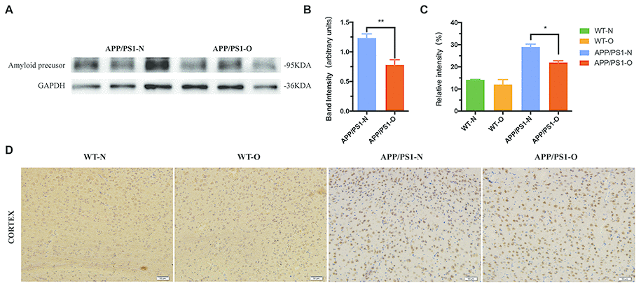 Then, we stained tissue sections with amyloid precursor in WT mice and APP/PS1 mice. We evaluated the degree of amyloid deposit of the cortex, which demonstrated that there are less difference between WT-N and WT-O group (Figure 3C and 3D). The IHC results matched the Western blotting results of APP/PS1 mice with large amount of amyloid deposit in the brain. Compared to WT mice, we found that APP/PS1 mice contain twofold higher levels of the Aβ (Figure 3D). In APP/PS1 mice, we observed that the cortical area covered by amyloid-β plaques was decreased (26%, P < 0.05) in LEO-treated APP/PS1 mice compared with untreated APP/PS1 mice (Figure 3D). This indicates LEO downregulate β - amyloid deposition in APP/PS1 mice. Representative images of the amyloid immunostaining specimens are shown for the four groups (Figure 3D).