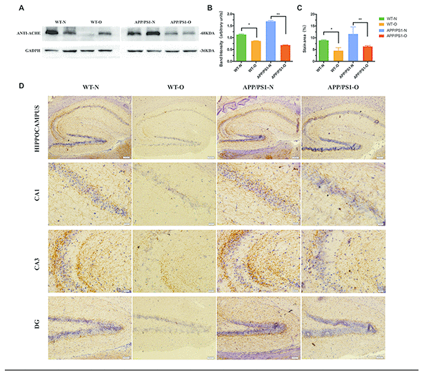Next, we examined the expression of AChE in the hippocampus by immunohistochemistry (IHC) using AChE antibody in WT and APP/PS1 mice (Figure 4D). The density of the AChE fibers in the hippocampal formation was decreased in the APP/PS1 mice compared with that in WT mice. IHC of the hippocampus CA3 and dentate gyrus (DG) was performed, and the results showed that AChE staining in APP/PS1 mice was increased compared with that in WT mice. We also found that LEO leads to a significant decrease in the number of AChE-positive cells in the CA1 compared with that in the untreated group, and quantitative analysis suggested that the contents of AChE decreased to 55 % (P < 0.01) in the untreated mice (Figure 4C). These data suggested that LEO treatment decreased the degeneration of the hippocampal cholinergic system by reducing AChE levels.
