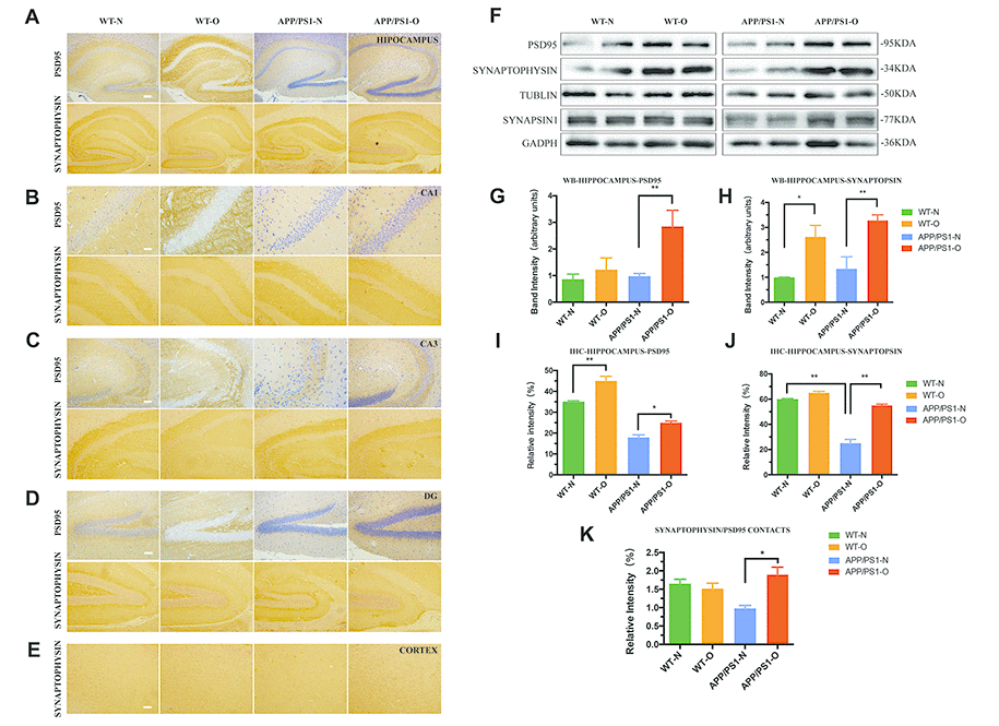 Next, we examined whether the treatment with LEO could improve the impaired synaptic density in the hippocampus. IHC analysis showed that LEO treatment improved the expression of PSD95 and synaptophysin in APP/PS1 mice (Figure 5A to Figure 5E). The pyramidal neurons in the CA3 of the hippocampus showed a strong positive signal of PSD95 in the cytoplasm while CA1 (Figure 5B) and DG (Figure 5D) regions showed a strong positive signal of synaptophysin in the nucleus. The intensity of synaptophysin/PSD95 contacts PSD95 (Figure 5K) was observed as an index of reactive synaptic density, showing an 18% decrease in the hippocampal region of APP/PS1 mice compared with that in the WT group. The intensity of synaptophysin/PSD95 contacts displayed a 37% increase in the hippocampal region in LEO-treated APP/PS1 mice compared with that in untreated APP/PS1 mice. However, no significant difference was found between LEO-treated and untreated WT mice (P > 0.05). Together, these results demonstrated that the synapse number and synaptic density can be improved by LEO inhalation. Overall, these results indicated that LEO prompts to the restoration of memories by re-establishing the synaptic network.
