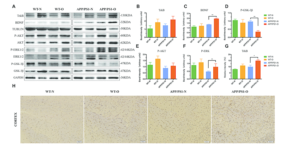 Additionally, considering that the presynaptic protein synaptophysin is a downstream target of the BDNF pathway, we sought to explain the regulating mechanism of LEO in hippocampal synaptogenesis. To accomplish this, we next tested TrkB-BDNF and rapid AKT-ERK kinase neurotrophic signaling in the brain of APP/PS1 mice and WT mice. Western blot data demonstrated that the phosphorylation levels of AKT and ERK in the hippocampus of LEO-treated APP/PS1 mice was increased by 20% (P > 0.05) and 63% (P < 0.01) compared with those in untreated APP/PS1 mice (Figure 6E and 6F). Likewise, studies in LEO-treated WT mice revealed a 43% increase in pAKT and 20% increase in pERK levels in the hippocampus, compared with those in untreated WT mice (Figure 6E and 6F). Results showed that the TrkB in LEO-treated APP/PS1 mice was rescued in the hippocampus and cortex by LEO (Figure 6A and 6H), while the BDNF levels were increased significantly (Figure 6C, P < 0.01), indicating a restoration of these signaling pathways. This appears to be a true “restore" and not just enhancement regulation by LEO in the brain because LEO could to restore the BDNF levels and phosphorylation of AKT and ERK in APP/PS1 mice but had no obvious effect in WT mice (Figure 6A), and APP/PS1 mouse brain may be more sensitive to LEO. The results suggest that the beneficial effect of LEO may be associated with its enhancement of prominent plasticity.