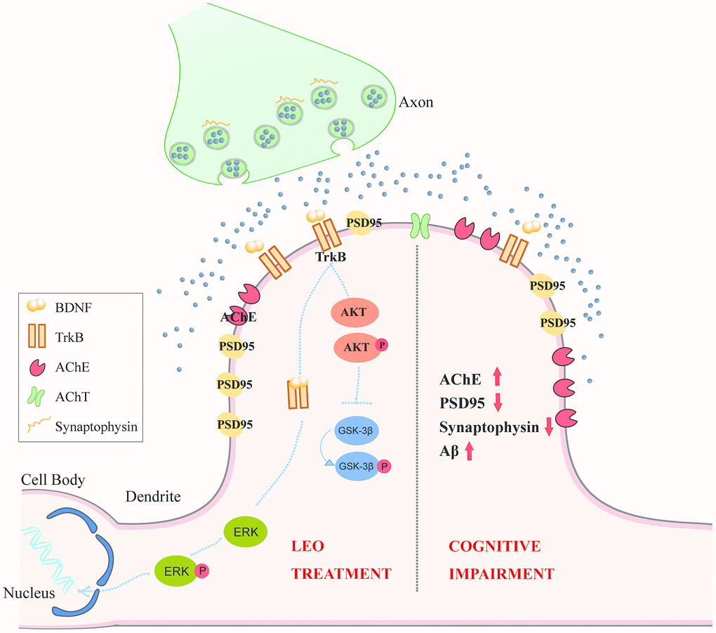 In our work, we investigated the effect of LEO in the established APP/PS1 mouse model of AD and WT mice. The APP/PS1 mouse model is characterized by dysfunction of neurons, and visible plaque deposition is detected after 6 months [49]. The most important findings of the present research were that LEO treatment partly restored hippocampal synaptic plasticity in LEO treated APP/PS1 mice. In our study, we found that 4 weeks of LEO treatment partly reversed the spatial reference memory impairment of 8-month-old APP/PS1 mice. An increased the expression of BDNF, TrkB and phosphorylated AKT and ERK, including the levels of marker proteins for synaptic integrity and plasticity that could induce the restoration of spatial memories. LEO-treated APP/PS1 mice also displayed a significant decrease in AChE in the hippocampus, which would increase ACh levels. These results are summarized in Figure 7. In line with this observation, spatial reference memory was partially restored in the LEO-treated APP/PS1 group. Many preclinical studies have attempted to restore synaptic plasticity and memory function in mouse models of amyloid pathology [41]. This is the first confirmation that LEO effects, including synaptic plasticity and the synapse number, occur in the hippocampus of APP/PS1 mice, a model of cognitive dysfunction. Importantly, LEO has few side effects and can penetrate well into the BBB [21, 50]. Some studies have shown that the permeability of essential oil can enhance the signal transmission [51], and some components of essential oil can increase the permeability of water, which can be widely used in industrial production [52]. Overall, the findings in this investigation suggest an important potential role for LEO as a therapeutic agent to restore memory function in AD.