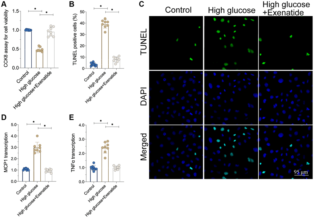 In this study, hyperglycemia was induced in cardiomyocytes [20], which were then treated with Exenatide. The viability of cardiomyocytes was determined through CCK8 assay. As shown in Figure 1A, cardiomyocyte viability was reduced in response to hyperglycemia whereas exenatide treatment improved it. In agreement with this effect, we also observed an increase in TUNEL-stained apoptotic cells after hyperglycemia treatment (Figure 1B, 1C). Exenatide treatment reduced the ratio of TUNEL-positive cells, reconfirming that such treatment increases cardiomyocyte viability and survival. In addition to cell death, we also assessed the inflammation response by measuring the levels of pro-inflammatory factors. As shown in Figure 1D, 1E, compared to the control group, MCP1 and TNFα transcription was elevated in hyperglycemic cells. On the other hand, Exenatide treatment inhibited the upregulation of such pro-inflammatory factors, suggesting that Exenatide inhibits hyperglycemia-induced inflammation in cardiomyocytes.
