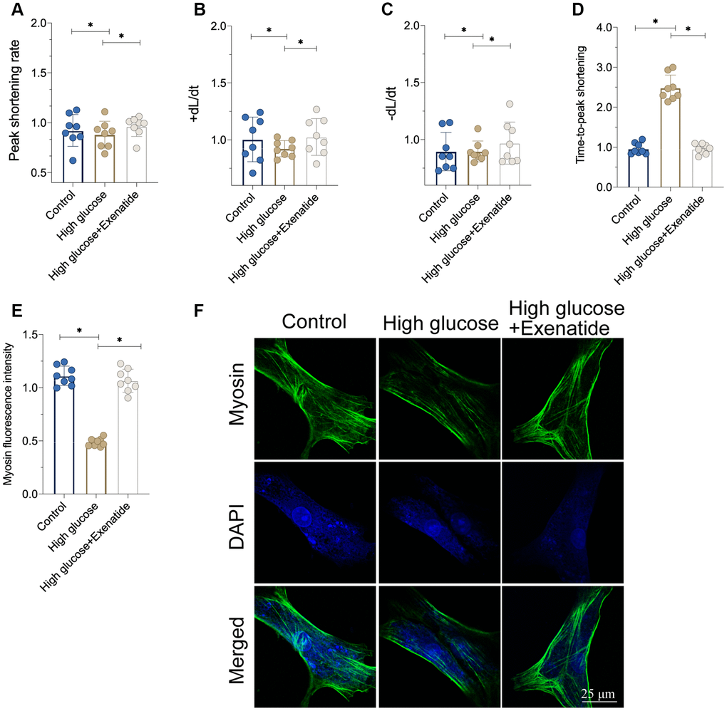 We isolated single cardiomyocytes after hyperglycemia treatment and assessed their contractile properties [21, 22]. As shown in Figure 2A–2D, the peak shortening rate was downregulated in the hyperglycemia group. Similarly, the maximal velocity of shortening (+dL/dt) and maximal velocity of re-lengthening (−dL/dt) were also impaired by hyperglycemia in cardiomyocytes. The time-to-peak shortening (TPS) was elevated in hyperglycemic cardiomyocytes when compared to controls. Therefore, this indicates that cardiomyocytes contraction and relaxation functions are compromised by hyperglycemia, whereas Exenatide treatment restored the peak shortening rate, +dL/dt, −dL/dt and TPS (Figure 2A–2D). This suggests that cardiomyocyte function could be sustained by Exenatide under hyperglycemic stress. At the molecular level, cardiomyocyte contractility is controlled by cytoskeletal proteins such as Myosin. Interestingly, Myosin levels were reduced in hyperglycemic cardiomyocytes whereas Exenatide treatment increased them, thereby rescuing contractile functions.