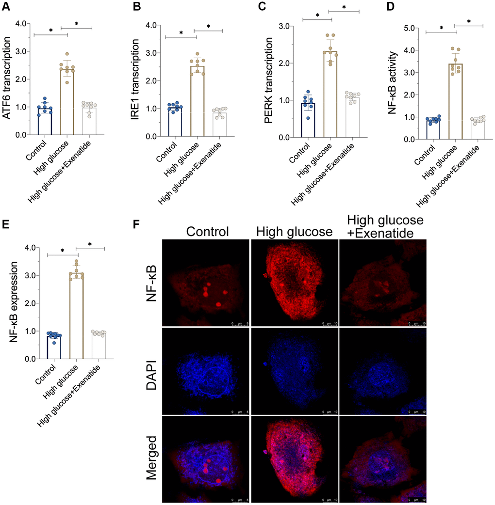 As discussed above, hyperglycemia-induced cardiomyocyte damage is associated with ER stress and NF-κB signaling pathway activation [23, 24]. Accordingly, we observed alterations in ER stress and NF-κB activation in response to Exenatide treatment. As shown in Figure 3A–3C, the transcriptions of PERK, ATF6 and IRE1 were increased in response to hyperglycemia treatment, suggesting an activation of ER stress. In addition, we also found that the activity of NF-κB was also augmented in hyperglycemic cells (Figure 3D). Interestingly, Exenatide treatment reduced the levels of PERK, ATF6 and IRE1 (Figure 3A–3C), suggesting that Exenatide inhibits ER stress. In addition, NF-κB activity was also inhibited by Exenatide treatment (Figure 3D). We also observed an upregulation in NF-κB expression in hyperglycemic cells through immunofluorescence assays while Exenatide treatment reduced NF-κB expression to near-normal levels (Figure 3E, 3F). Overall, our results indicate that Exenatide regulates inhibits ER stress and the NF-κB signaling pathway.