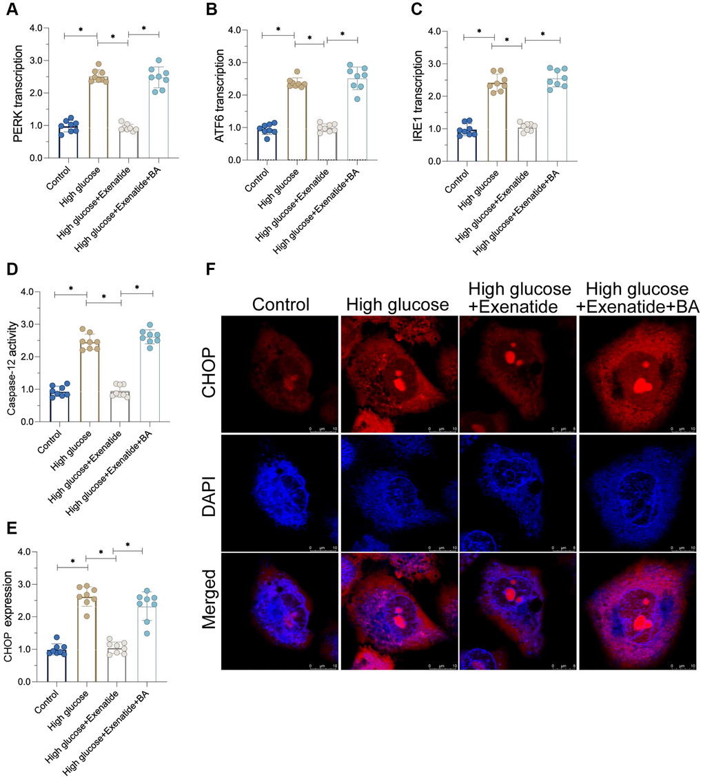 To verify whether NF-κB pathway is required for Exenatide-induced ER stress protection [25], we added an agonist, Betulinic acid (BA), to activate the NF-κB pathway. Then, ER stress was analyzed again. As shown in Figure 4A–4C, ER stress markers were elevated in the hyperglycemia group compared to controls. Exenatide treatment prevented the upregulation of ER stress-related markers whereas these effects were not evident in BA-treated cardiomyocytes. Thus, our results indicate that inhibition of the NF-κB pathway by Exenatide is required for ER stress inhibition. Additionally, we also measured the activity of caspase-12 and CHOP. As shown in Figure 4D–4F, we observed increased caspase-12 and CHOP activity in the hyperglycemia group. Although Exenatide treatment inhibited caspase-12 and CHOP activity, this action is not apparent in BA-treated cardiomyocytes. Altogether, our results confirm that Exenatide inhibits ER stress through the NF-κB pathway.