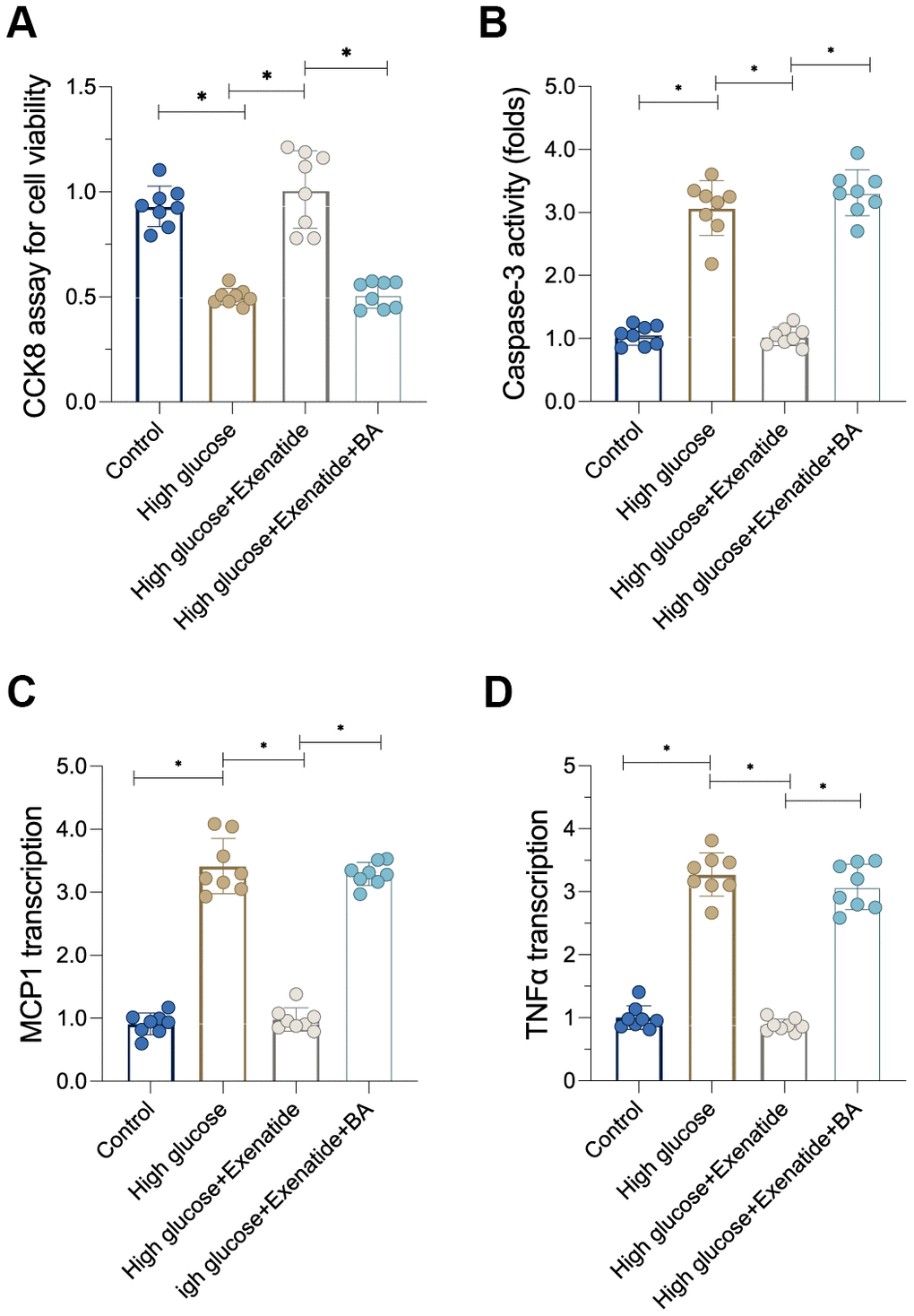 Next, we sought to determine whether the NF-κB pathway is involved in Exenatide-regulated cardiomyocyte death and inflammation [26]. First, cardiomyocyte viability, as evaluated through CCK8 assay, was reduced after exposure to hyperglycemia treatment whereas Exenatide treatment restored cardiomyocyte viability in a NF-κB-dependent manner. Indeed, re-activation of the NF-κB pathway abolished the pro-survival effects of Exenatide on cardiomyocytes (Figure 5A). In addition to CCK8 assay, we also measured the activity of caspase-3, a critical regulator of cell apoptosis. As shown in Figure 5B, caspase-3 activity was increased in the hyperglycemia group. Exenatide caused a decrease in caspase-3 activity whereas re-activation of the NF-κB pathway through supplementation with BA induced an activation of caspase-3 in Exenatide-treated cardiomyocytes. Overall, our results verified that NF-κB pathway inhibition accounts for Exenatide-mediated cardiomyocyte survival. In addition to cardiomyocyte viability, we also evaluated the inflammation response. Pro-inflammatory factors were upregulated in response to hyperglycemia treatment whereas Exenatide treatment inhibited the transcription of inflammatory factors (Figure 5C, 5D). Re-activation of the NF-κB pathway abolished Exenatide-mediated inflammation inhibition. Therefore, our data suggest that Exenatide also promotes cardiomyocyte viability and inhibits inflammation through the NF-κB pathway.