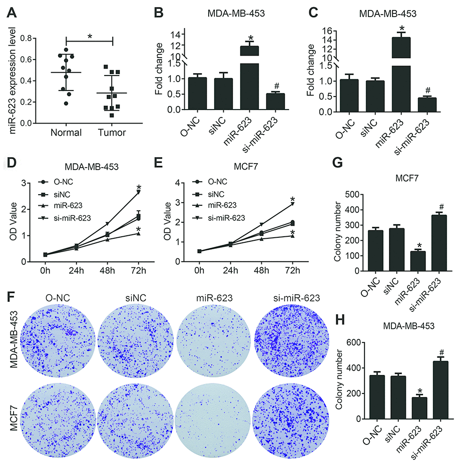 In order to evaluate the role of miR-623 in the two selected human breast cancer cell lines, it was transfected into MDA-MB-453 and MCF7 cells, and qRT-PCR was used to quantify its expression. As shown in Figure 1B and 1C, we found that the expression of miR-623 was significantly increased in the miR-623 group and decreased in the si-miR-623 group cells (P < 0.05). The overexpression and knockdown of miR-623 was confirmed before further analysis.
