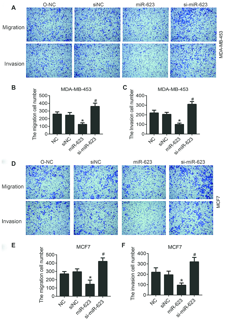 To further investigate the effect of miR-623 in regulating cell motility, Transwell assays were used to evaluate the role of miR-623 on MDA-MB-453 and MCF7 cells migration and invasion. As shown in Figure 3A–3C, the invasive capability of cells with high level of miR-623 was inhibited significantly, while it was promoted in cells with low levels of miR-623 (P < 0.05). Similarly, overexpression of miR-623 resulted in a significant decrease in cell migration ability, and miR-623 knockdown resulted in opposite results (P < 0.05) (Figure 3D–3F). These results suggest that miR-623 is able to suppress the ability of breast cancer cells to invade and migrate.