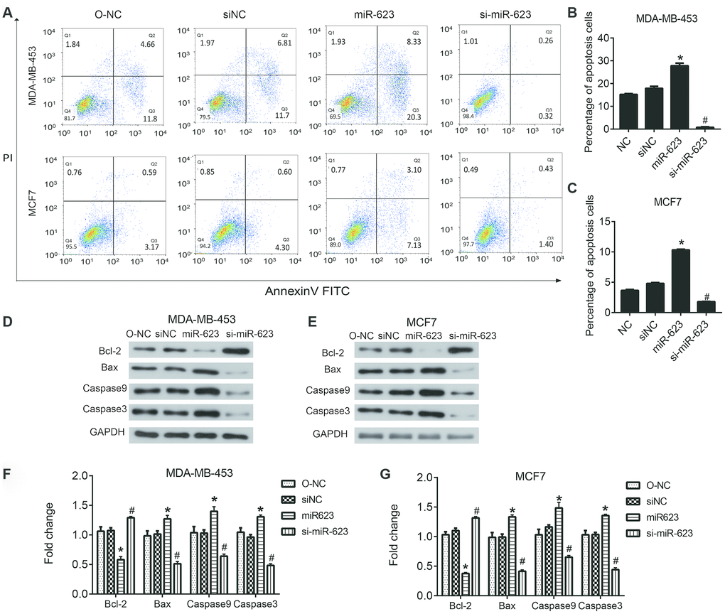 It is well known that apoptosis is associated with the mechanism of tumor progression. Therefore, we next detected whether the overexpression of miR-623 would have any effects on cell apoptosis. Flow cytometry and western blot analysis were performed to evaluate apoptosis of MDA-MB-453 and MCF7 cells (Figure 4A). The flow cytometry results showed that upregulated miR-623 could promote cell apoptosis, and downregulated miR-623 could inhibit cell apoptosis compared to the NC group (P < 0.05, Figure 4B and 4C). These results were further validated by western blot assay. We examined the expression of Bcl2, Bax, Caspase 9 and Caspase 3 proteins. Bcl2 is an anti-apoptotic protein and Bax is a pro-apoptotic protein, while Caspase 9 is an apoptotic initiator and Caspase 3 is an apoptotic executioner. these proteins play important roles in the process of apoptosis. The western blot results showed that overexpression of miR-623 down-regulated Bcl2expression and up-regulated the expression of Bax, Caspase 9 and Caspase 3. miR-623 knockdown resulted in opposite results (P < 0.05, Figure 4D–4G). Collectively, these data suggested that miR-623 could promote breast cancer cell apoptosis.