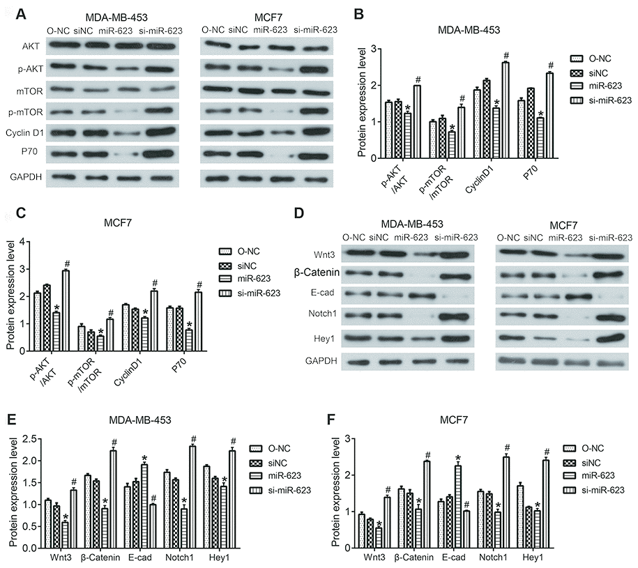 The PI3K/AKT/mTOR and Wnt/β-catenin signaling pathway play important roles in proliferation and survival of breast cancer. Therefore, we decided to eventually investigated the involvement of both PI3K/AKT and Wnt/β-catenin signaling pathways in tumor progression. Western blot results showed that miR-623 inactivated the PI3K/AKT signaling pathway by decreasing expression of phosphorylated AKT (p-AKT), phosphorylated mTOR (p-mTOR), Cyclin D1 and S6k/P70, but without predominantly affecting total AKT and mTOR (P < 0.05, Figure 5A–5C). Likewise, we examined the Wnt/β-catenin signaling pathway related protein wnt3, β-catenin, Notch1, and HEY1. The expression levels of these proteins were also downregulated; however, E-cad expression was upregulated in the miR-623 overexpressed MDA-MB-453 and MCF7 cells. In contrary, miR-623 knockdown resulted in opposite results. (P < 0.05, Figure 5D–5F). Altogether, the suppression of these downstream effectors in the two signaling pathways demonstrated the effects of miR-623 on breast cancer cell proliferation, cell cycle and metastasis.