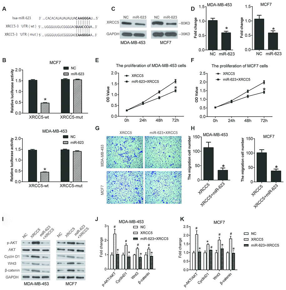 We began our experiment by overexpressing miR-623 in breast cancer cell lines MDA-MB-453 and MCF7. Based on these cell lines, we found exogenous overexpression of miR-623 suppressed cell proliferation, migration and invasion; however, this promoted cell apoptosis. In contrary, knockdown of miR-623 demonstrated opposite results. At the molecular level, further research has revealed that miR-623 resulted in downregulation of Cyclin-Dependent Kinase (CDK) 4/6 in MCF7 cells, and inhibition of the phosphatidylinositol-3-kinase (PI3K)/Akt/mTOR and Wnt/β-Catenin signaling pathways in MDA-MB-453 and MCF7. Moreover, we proved that miR-623 directly targets XRCC5, which is critical for miR-623-induced proliferation and migration blockage in breast cancer cells.