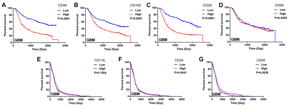 In this study, we obtained data on glioma patients from the databases of the Chinese Glioma Genome Atlas (CGGA) and The Cancer Genome Atlas (TCGA). We constructed Kaplan-Meier survival curves and performed a log-rank comparison to analyze the correlations between MSC surface marker levels in glioma tissues and overall glioma patient survival. The expression of the positive MSC markers CD44, CD105 and CD29 exhibited a significant inverse correlation with the prognosis of glioma patients (Figure 1A–1C). Another positive marker, CD90, was not significantly associated with overall survival (Figure 1D). Additionally, the expression of the negative MSC markers CD11b, CD34 and CD45 did not correlate significantly with the prognosis of glioma patients (Figure 1E–1G). These results suggested that higher MSC marker expression was associated with a shorter survival period and a poorer prognosis in glioma patients.